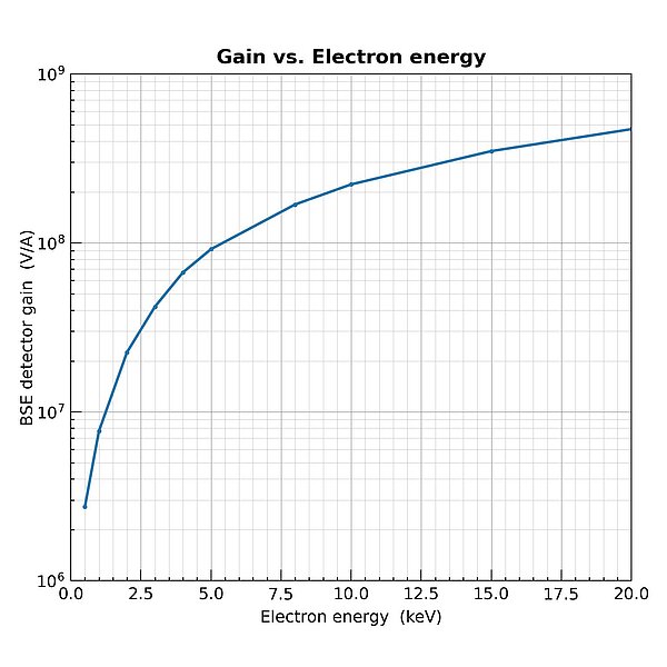 Advanced BSD gain vs. electron landing energies on the detector. Preamplification gain: 1×10⁵ V/A