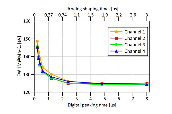 Energy resolution versus processing time measured with all 4 channels of Rococo2 Detector