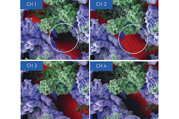 SEM EDX elemental mapping of iron and kaolinite powder on carbon – almost shadowless by using the different channels