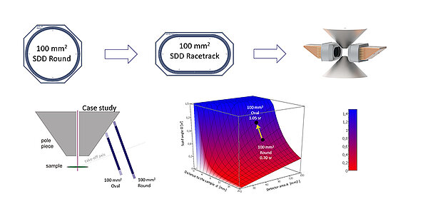 There is a limitation if only the active area of the SDD is increased. Therefore PNDetector invented the so called Racetrack chip structure. These SDDs make use of an oval shaped active area. Therefore, they can be placed extremely close to the sample even in applications where the available space is restricted. This leads to largely increased solid angles.