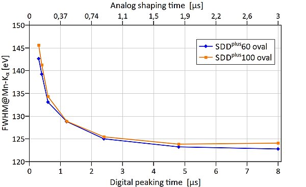 [Translate to Chinese:] Energy resolution plotted against processing time measured with two different ´Racetrack SDDs´
