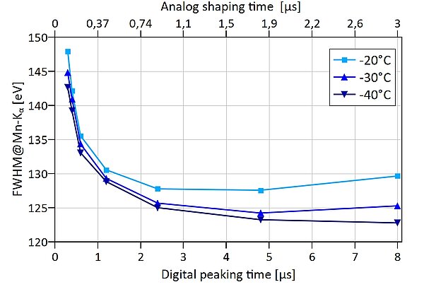 [Translate to Chinese:] Energy resolution plotted against processing time measured with an SDDplus-60 detector at various chip temperatures