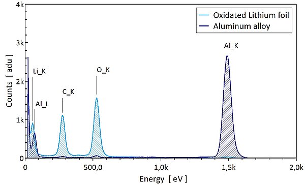 [Translate to Chinese:] EDX spectra of light-element samples measured in SEM with a windowless SDDplus-100 detector module operated at -45°C chip temperature