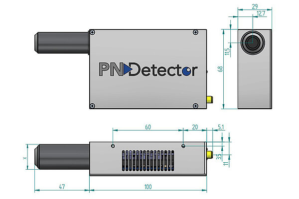 Dimensions of standard XRS-A with Beryllium Window, X is 18 for 30 mm² and 21.3 for 60 mm² active area, all dimensions are given in mm.