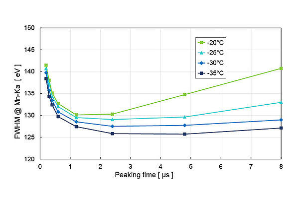 Resolution (FWHM) over Peaking Time of XRP-A-100 oval, dependent on temperature