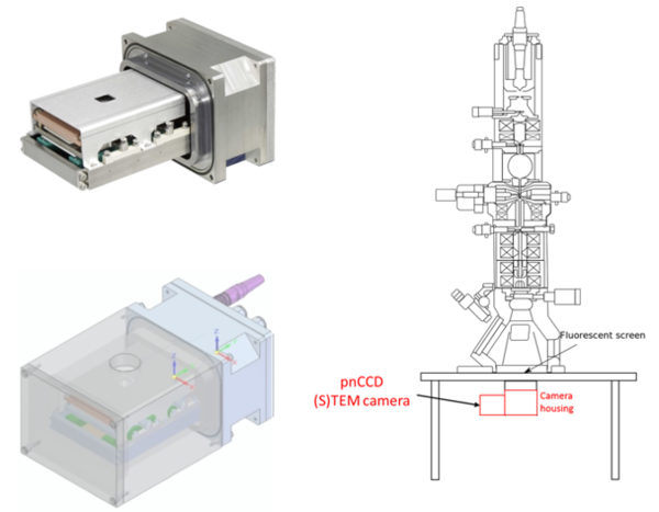 This pnCCD (S)TEM camera version is compatible with TEMs where no EELS spectrometer is installed at the bottom of the microscope, or TEMs with an in-column filter (Omega filter).
