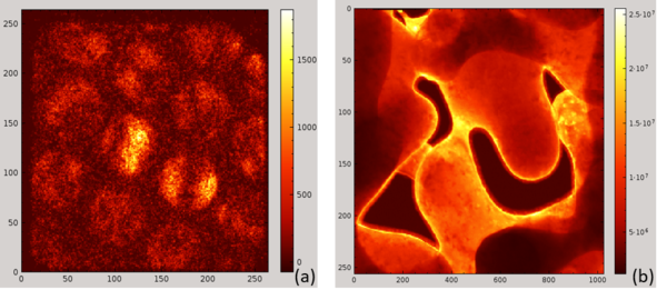 Due to its extremely high signal-to-noise ratio of 300:1 at 80 keV, the pnCCD (S)TEM Camera® provides the capability of single electron measurement. Examples of measurements which demonstrate the benefit of this capability are shown on the right side. Each pattern in image (a) shows the signal of a single primary electron (80 keV).