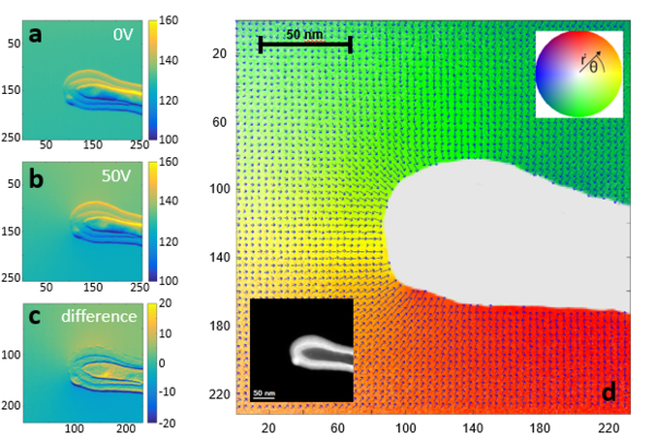 Electric field around a tungsten needle. Shifts of the BFDs are calculated from 4D-STEM datasets acquired with and without applied voltage. (a) Centroid image in y-direction at 0 V and (b) at 50 V. (c) difference of (a) and (b). (d) Vector field proportional to the local electric field calculated from shifts of the BFD position in x- and y-direction. Additionally, the background color emphasizes the field direction. The inset shows a STEM image simultaneously acquired with an ADF detector. In collaboration with FZ Jülich