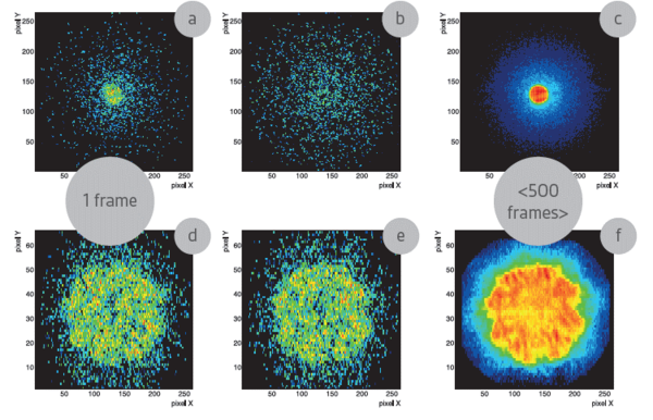 Example STEM measurements: (a-c) bright field and dark field measured simultaneously in full frame mode (264x264 pixel) at 1 000 fps. (d-e) bright field intensity distribution measured in 4x binning mode (66x264 pixel) at 4 000 fps. Images (a,b) and (d,e) represent single frames, images (c) and (f) are averaged over 500 frames.
