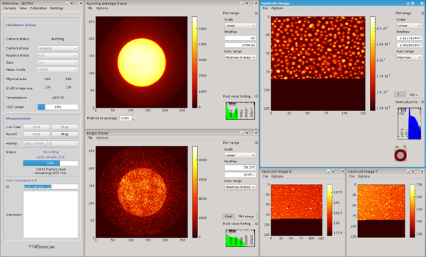 The PNOnline software provides all the functionality necessary to control the PNDetector’s pnCCD (S)TEM camera system and conveniently acquire high quality data. Versatile live displays provide instantaneous feedback about the bright field disk or diffraction pattern on the detector and allow effective adjustment of the camera settings. Data can be recorded in STEM or TEM measurement mode and is saved in PNDetectors’ frms6 file format which guarantees full raw data access, and can easily be used with common data analysis frameworks, like the LiberTEM project. Various masks can be selected for flexible live synthetic imaging.