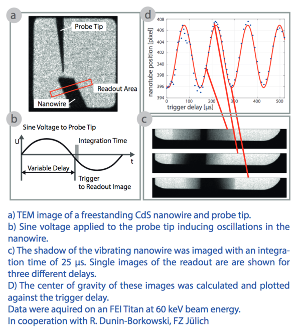Based on the high readout speed of 1000 fps in full frame mode and up to 8000 fps with windowing and binning mode, the pnCCD (S)TEM Camera® gives the possibility to investigate chemical or physical processes in the 0.1 - 1 ms regime. This capability is demonstrated by the experiment shown on the right side, where the induced resonant oscillation of a freestanding CdS nanowire was measured. The readout of the camera was externally triggered with a variable delay with respect to the zero crossing of the sine function driving the oscillation with 1.85 kHz. The analysis of the position of the nanowire acquired by this measurement revealed the resonant frequency of the nanowire to be approximately 4 times the excitation frequency. Elastic properties of the nanowire can be deduced from these measurements through further analysis.