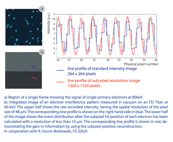 Due to its extremely high signal-to-noise ratio of 300:1 at 80 keV, the pnCCD (S)TEM camera can detect single electrons. Each pattern in image (a) shows the signal of a single primary electron (80 keV). The single electron events can be pro-cessed to receive images with a spatial resolution better than the physical pixel size. This proces-sing, which is called subpixel imaging, is based on advanced center of gravity methods. It works by taking into account the track and the distribution of the signal electrons in the detector that have been created by the primary electron. The example (b) below shows an electron hologram before (top) and after sub-pixel processing (bot-tom). Comparing the line proles (red and blue curves in the graph underneath) demonstrates the improved resolution of the interference pattern.