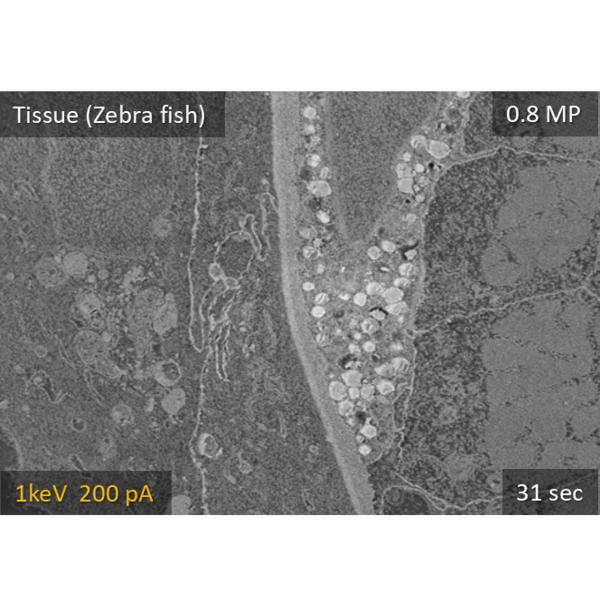 Bio science application: observe beam sensitive samples with superior quality. SEM image taken from a biological tissue at 1 keV beam energy