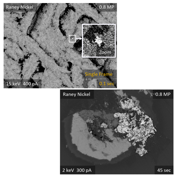 Particle analysis application: SEM images taken at high and very low beam energies just by a single click on the gain settings of the Switchable Gain Advanced BSD Software. There is no smearing effects between single pixels in single frame shots at high energies.