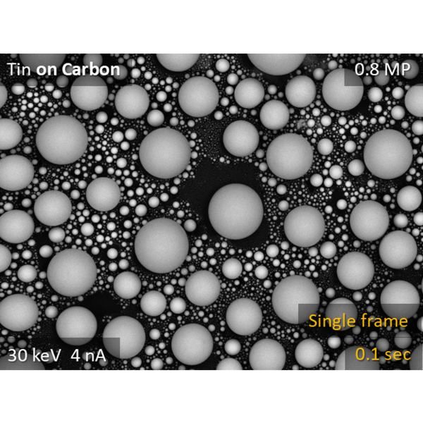 SEM image acquired with Switchable Gain Advanced BSD set at “high speed mode”, corresponding to gain setting of 1×10⁵ V/A. At a primary beam energy of 30 keV, the image acquisition is performed at a very high speed (down to 0.1 s per frame).